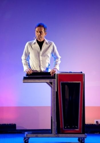 Artysta korzysta z pomocy dwóch lub trzech atrakcyjnych asystentek , a sam 5-krotnie zmienia kostiumy .